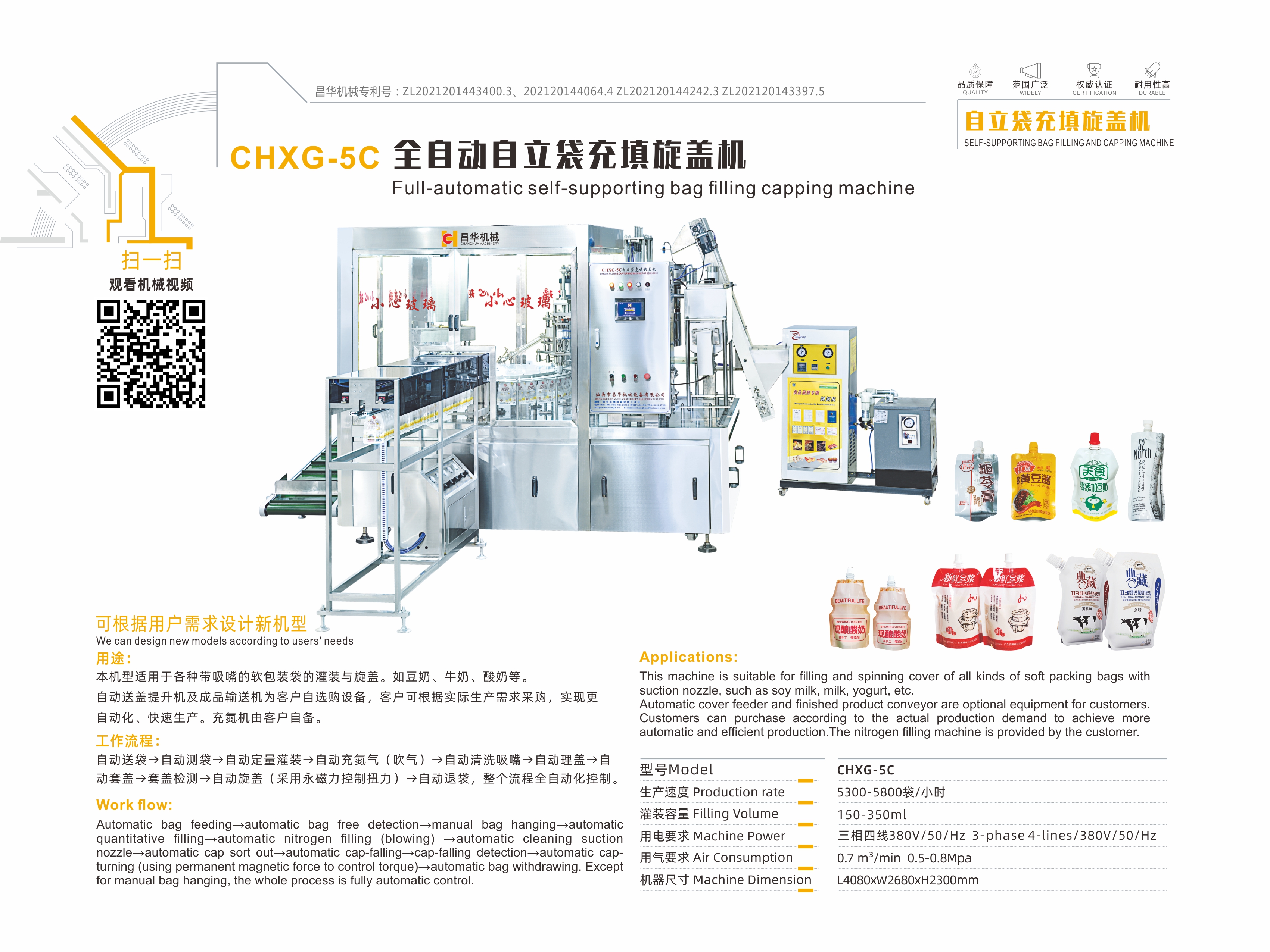昌華機(jī)械的主要產(chǎn)品包括:充填封口機(jī)系列、自立袋充填旋蓋機(jī)系列、給袋式包裝機(jī)系列、立式包裝機(jī)系列、瓶裝灌裝機(jī)、后道殺菌、包裝生產(chǎn)線系列等。